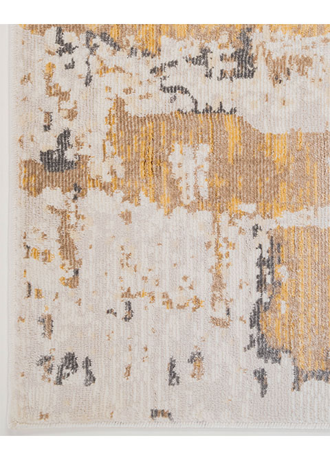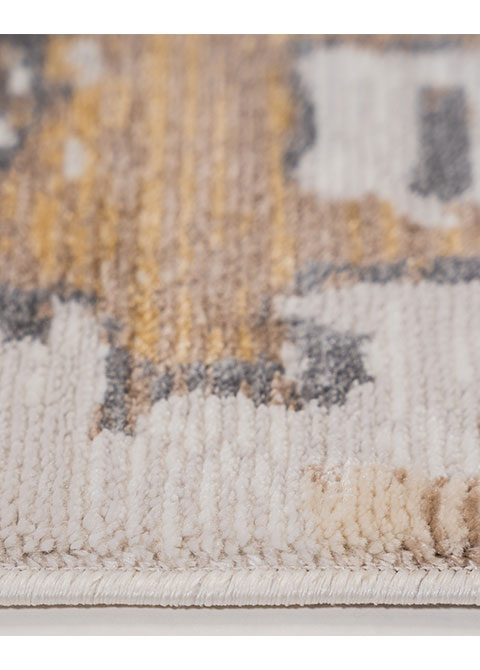 Agrega un toque artístico a tus espacios con este tapete de diseño abstracto. Ideal para interiores, su paleta de colores neutros y acentos dorados y grises lo convierten en una pieza versátil para cualquier decoración.